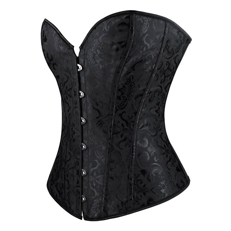 Timeless black jacquard overbust crossdresser corset with subtle patterned fabric, lace-up back, & flattering fit. Perfect for gothic & formal styling.