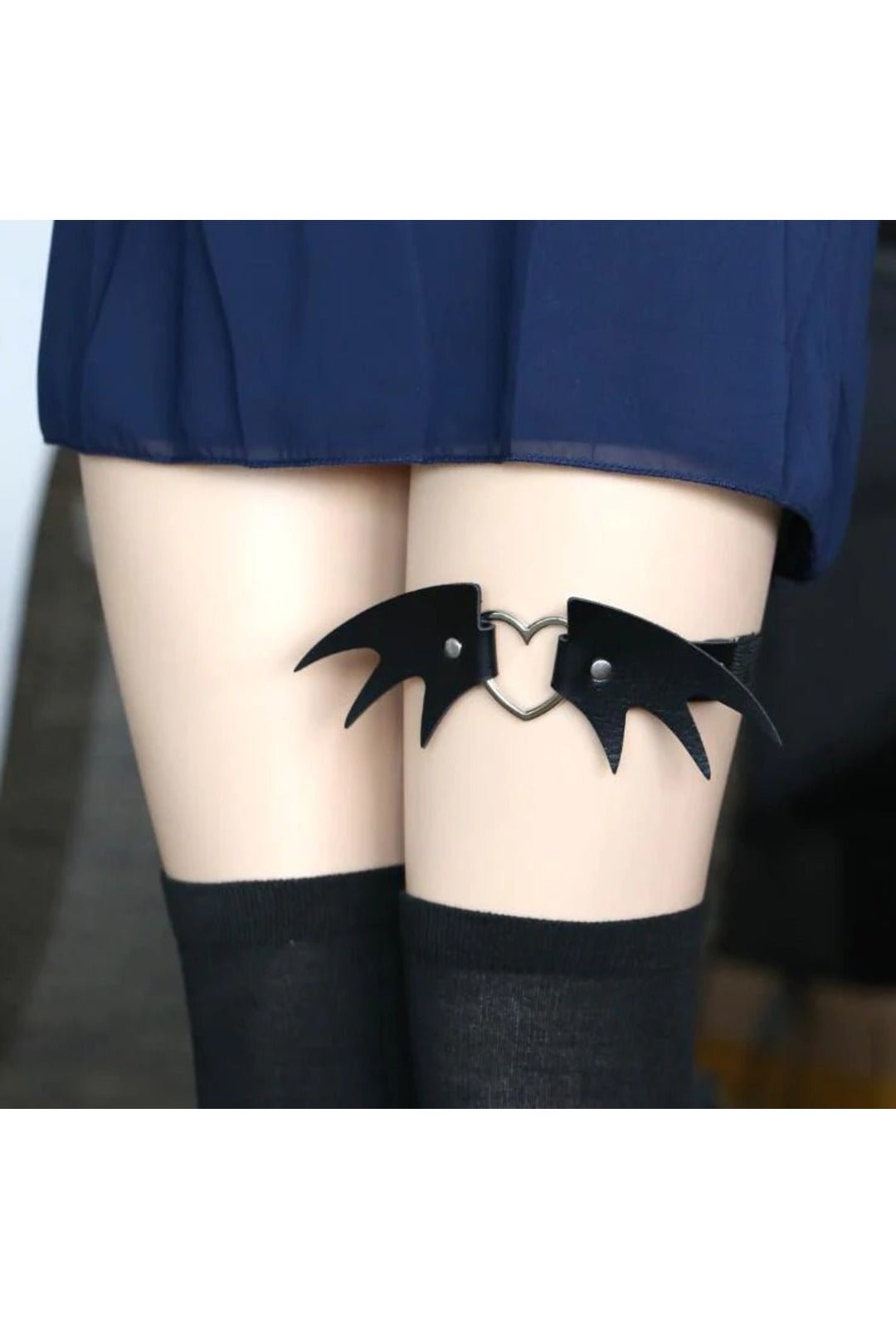 Unleash your dark side with this PU black leather bat garter. Featuring a striking silver heart pendant and adjustable fit, this edgy accessory adds a touch of gothic charm to any outfit. Perfect for cosplay, alternative fashion, or clubwear.