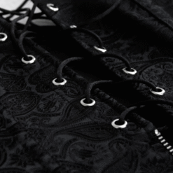 Embrace gothic steampunk fashion with this black jacquard strappy corset. Designed with adjustable straps, lace-up front and back, and a zip closure for ease, it’s an excellent costume corset for crossdressers and transgender women.