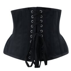 Elegant black steel-boned underbust crossdresser corset for waist training and body shaping. Featuring vintage-inspired Jacquard fabric, strong 10-eyelet back lacing for a dramatic cinched waist, and a secure front busk closure. Perfect for creating a classic hourglass silhouette.